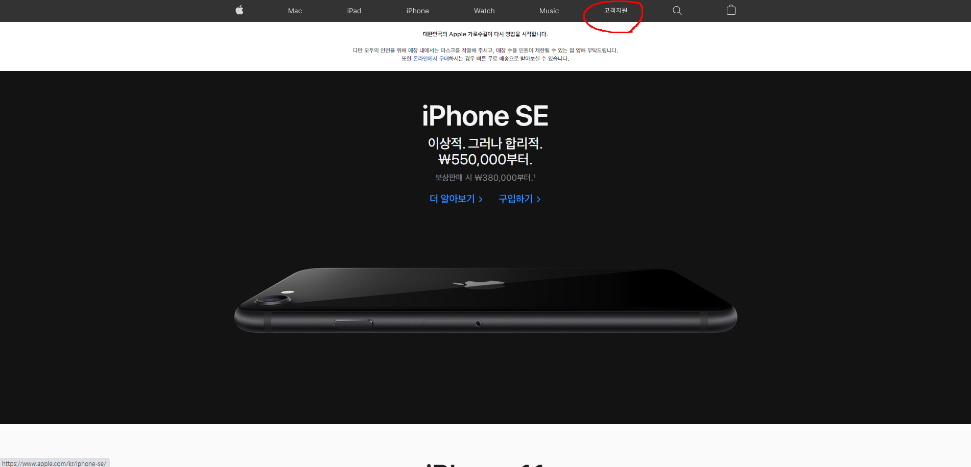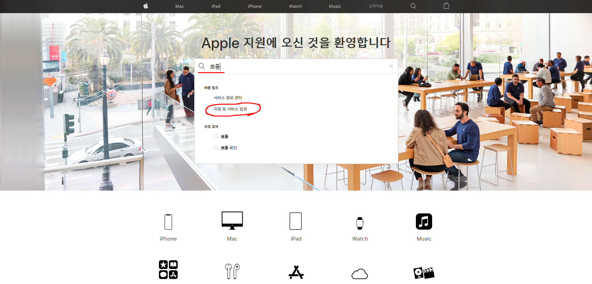 애플 공식 홈페이지의 메뉴 부분에서 고객지원 부분을 선택한 후